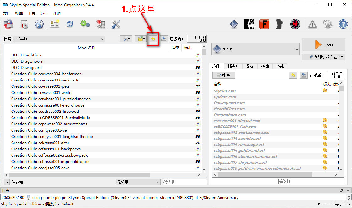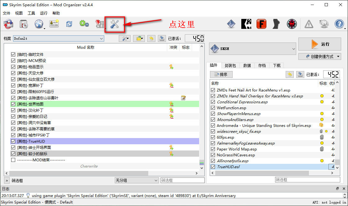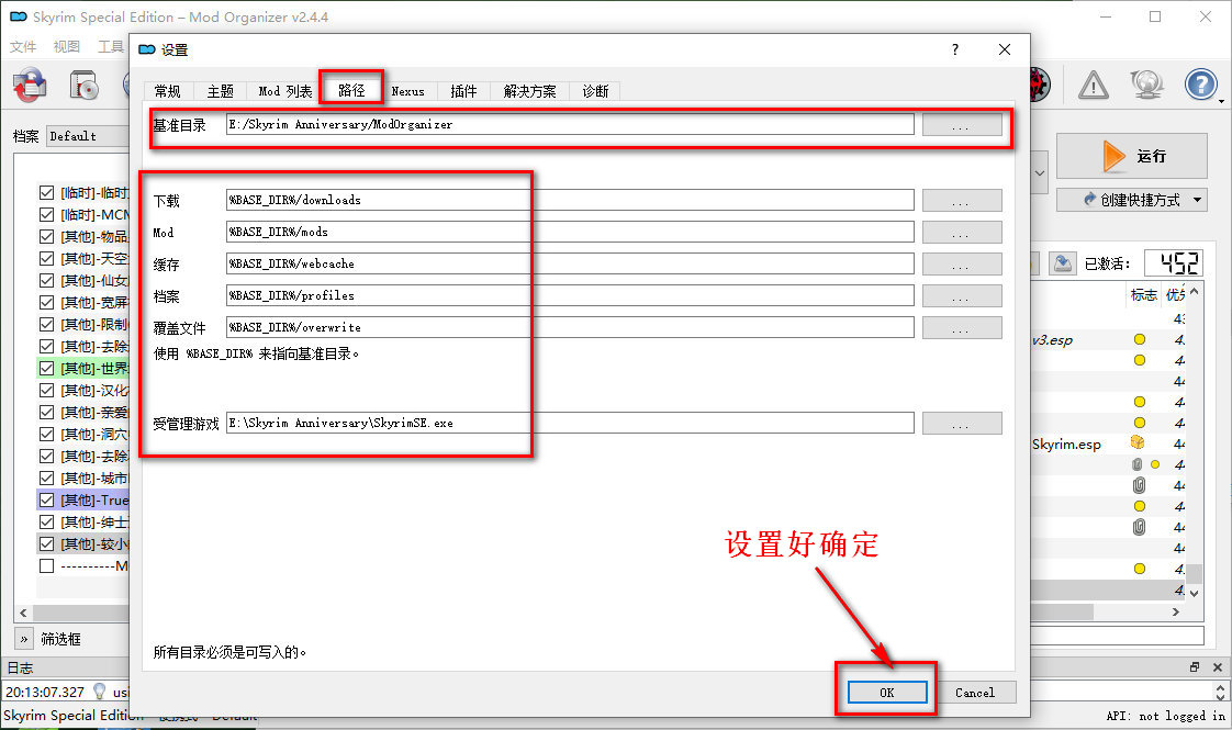 基准目录:E:/Skyrim Anniversary/ModOrganizer 下载目录:%BASE_DIR%/downloads MOD目录:%BASE_DIR%/mods 缓存目录:%BASE_DIR%/webcache 档案目录:%BASE_DIR%/profiles 覆盖文件目录:%BASE_DIR%/overwrite 受管理游戏目录:E:\Skyrim Anniversary\SkyrimSE.exe