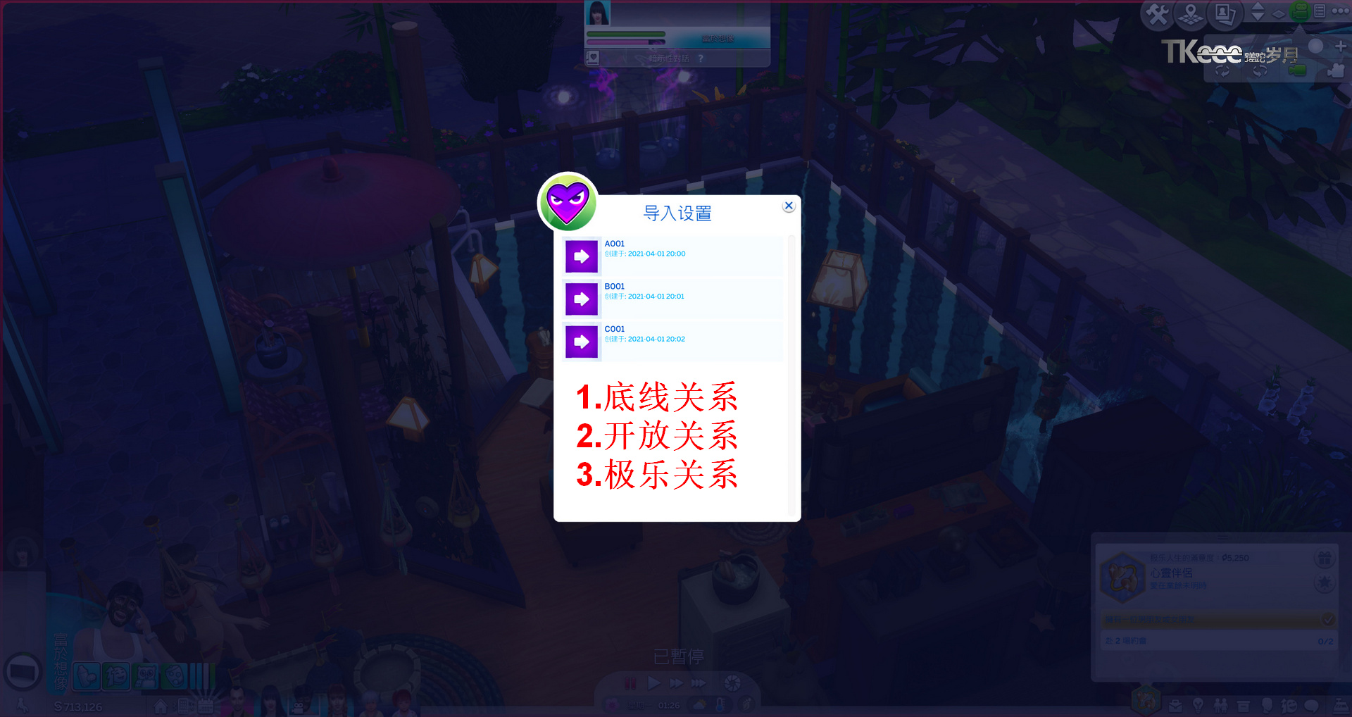 A001.底线关系,比较适合纯爱玩家。B001开放关系,比较适合享乐玩家。C001.极乐关系,在开放关系的前提下增加了血亲互动(不包含幼儿 儿童)。