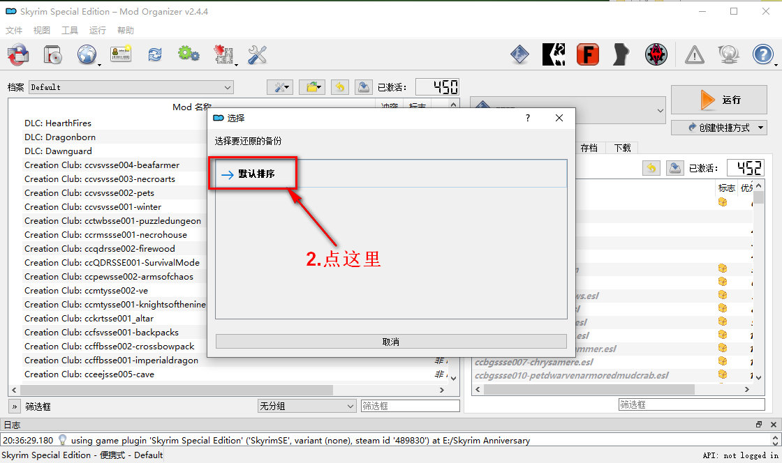 如果打开mo2管理器,排序错乱,或者很多mod没有勾选,按照下面的步骤恢复默认排序。